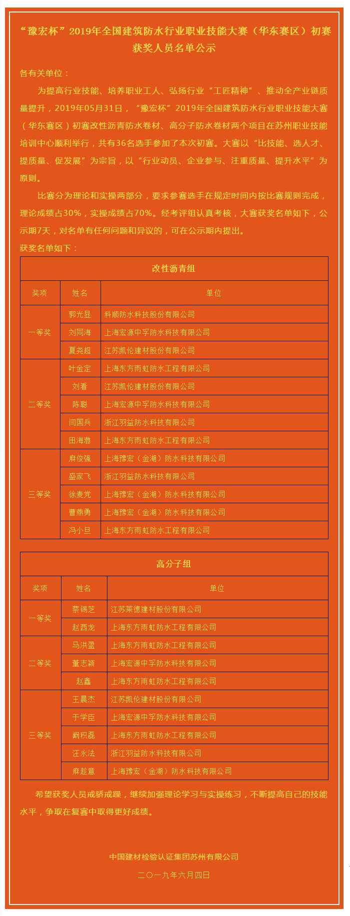 “豫宏杯”2019年全國建筑防水行業職業技能大賽(華東賽區)初賽獲獎人員名單公示