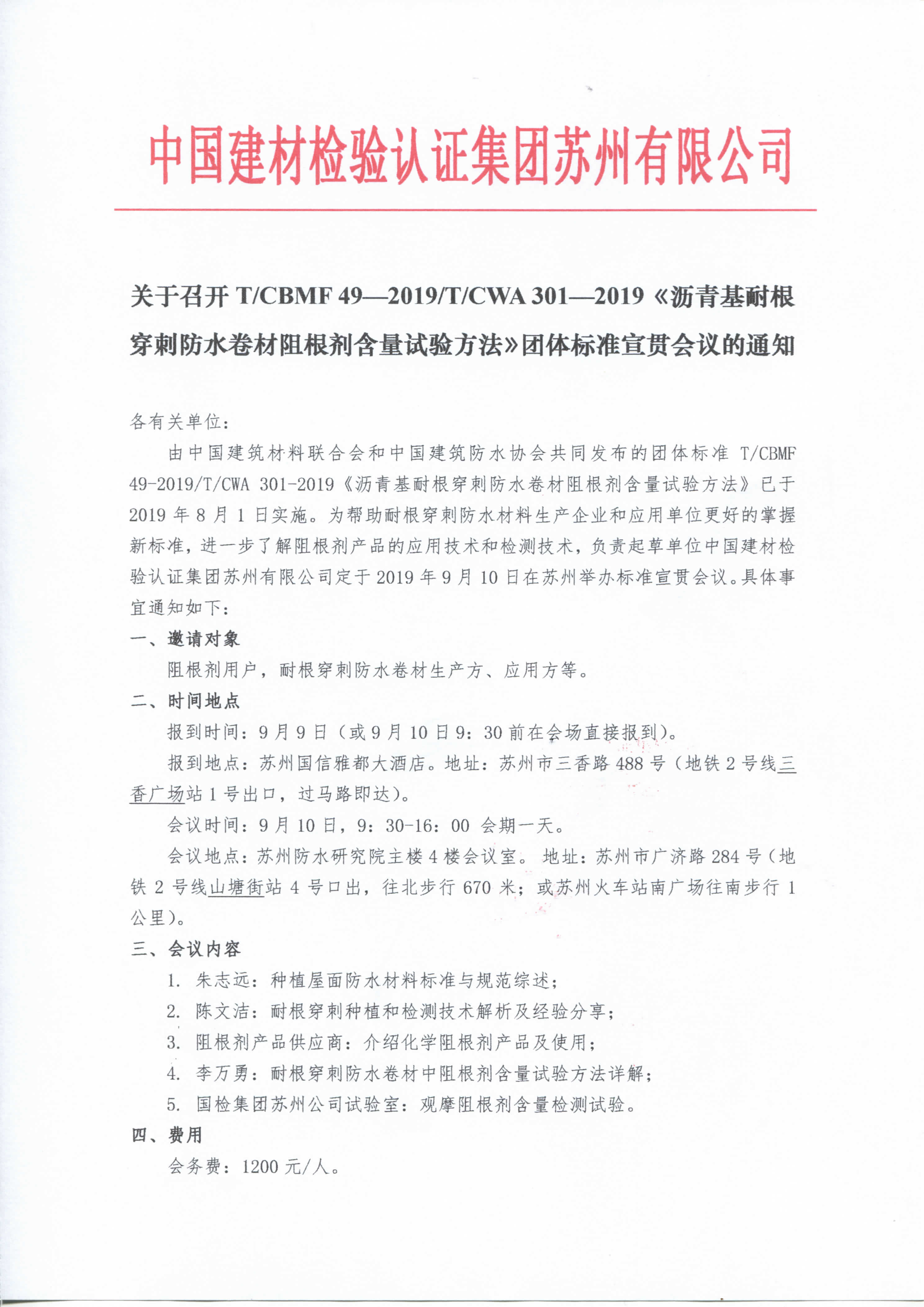 關于召開《瀝青基耐根穿刺防水卷材阻根劑含量試驗方法》團體標準宣貫會議的通知