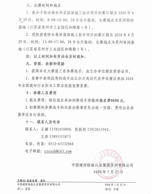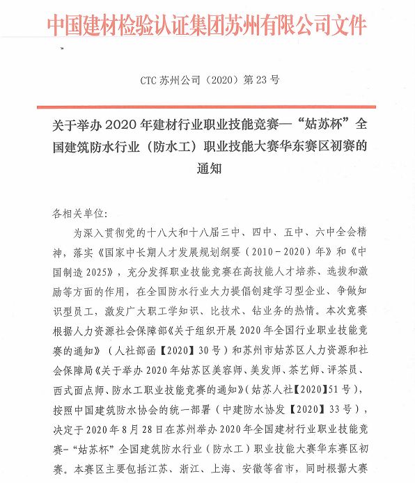 關于舉辦2020年建材行業職業技能競賽—“姑蘇杯”全國建筑防水行業(防水工)職業技能大賽華東賽區初賽的通知