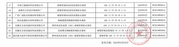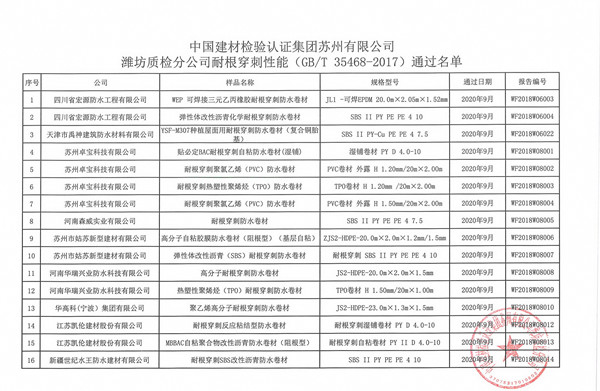 國檢集團蘇州公司濰坊質(zhì)檢分公司耐根穿刺性能(GB/T 35468-2017)通過名單(2020.9.30發(fā)布)