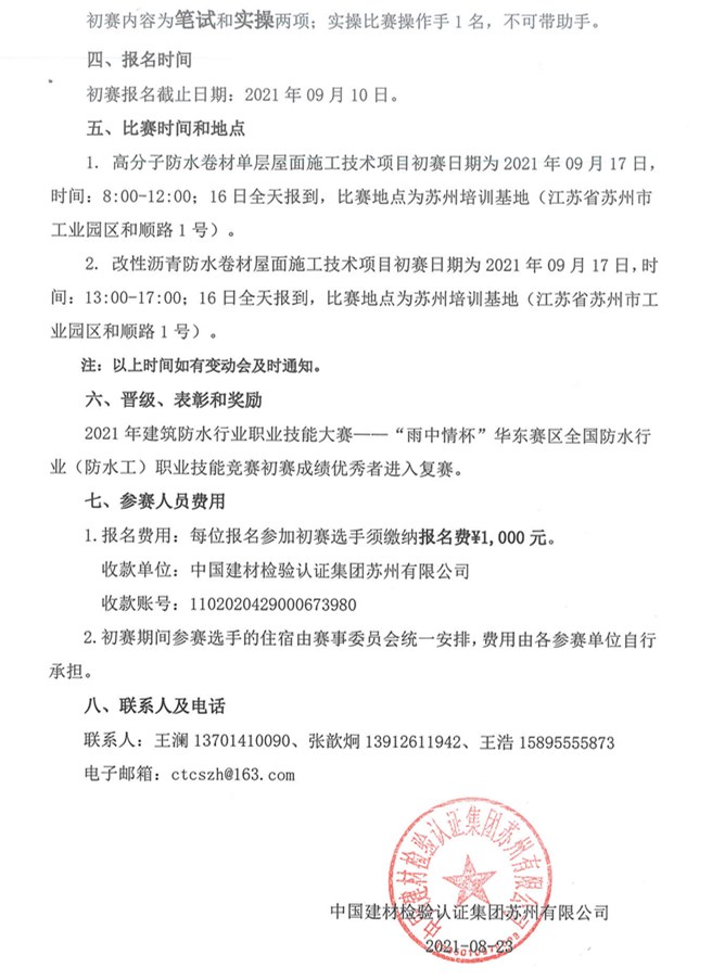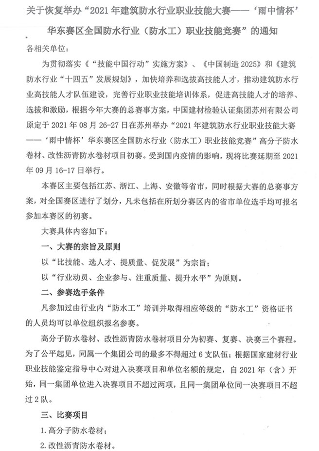 關于恢復舉辦“2021年建筑防水行業職業技能大賽——’雨中情杯‘華東賽區全國防水行業(防水工)職業技能競賽”的通知