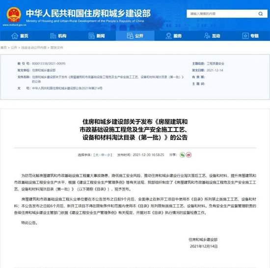 2021年12月14日,住建部印發的《房屋建筑和市政基礎設施工程危及生產安全施工工藝、設備和材料淘汰目錄(第一批)》明確:房屋建筑和市政基礎設施工程從業單位要在2022年09月14日后,全面停止在新開工項目中使用本《目錄》所列禁止的施工工藝、設備和材料。