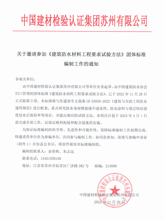 關(guān)于邀請(qǐng)參加《建筑防水材料工程要求試驗(yàn)方法》團(tuán)體標(biāo)準(zhǔn)編制工作的通知