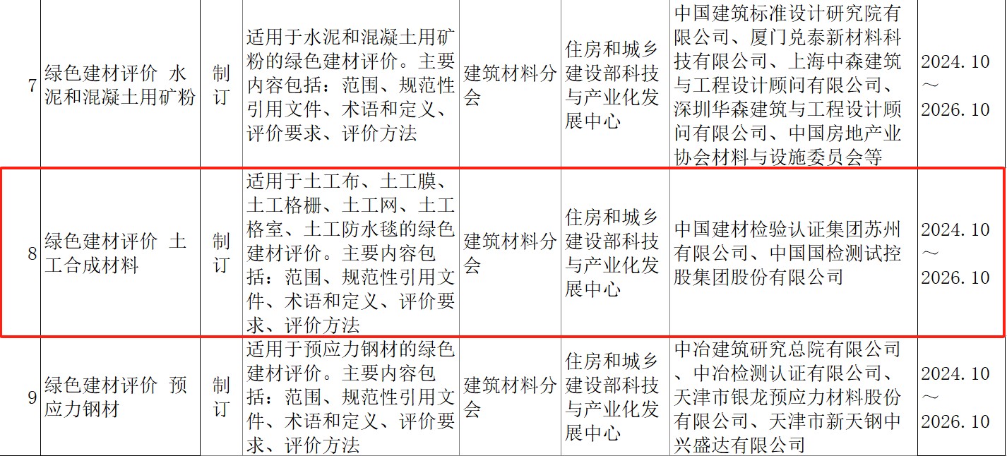 2024年10月28日,中國(guó)工程建設(shè)標(biāo)準(zhǔn)化協(xié)會(huì)發(fā)文《關(guān)于印發(fā)<2024年第二批協(xié)會(huì)標(biāo)準(zhǔn)制定、修訂計(jì)劃>的通知》(建標(biāo)協(xié)字[2024]28號(hào)),由住房和城鄉(xiāng)建設(shè)部科技與產(chǎn)業(yè)化發(fā)展中心聯(lián)合國(guó)檢集團(tuán)蘇州公司牽頭編制的《綠色建材評(píng)價(jià) 土工合成材料》項(xiàng)目列入計(jì)劃中,項(xiàng)目周期24個(gè)月。