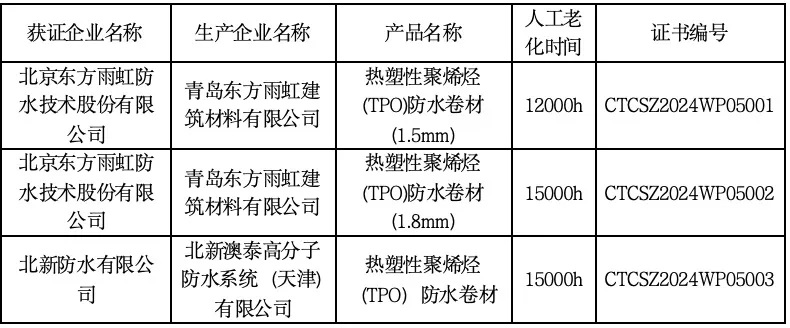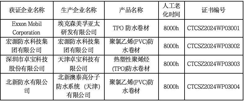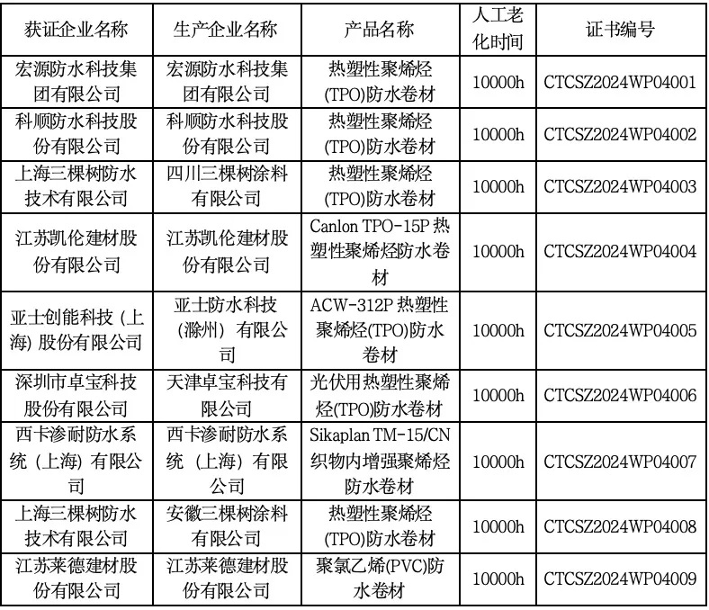 “工程材料耐老化性能證書”獲證產品名單(第一批)