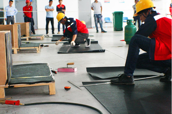 抽簽結束后,此次大賽隨即展開。本次大賽分理論和實操兩個環節,理論成績占30%,實操成績占70%。實操項目分為改性瀝青防水卷材項目、高分子防水卷材項目的比拼。理論考試現場,選手們沉著冷靜。實操考試現場,比賽緊張有序,有條不紊地進行。