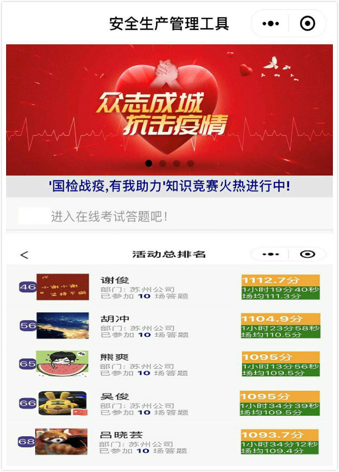 2月13日,集團組織開展為期十天的“國檢戰“疫”,有我助力”為主題的網絡知識競賽,蘇州公司綜合辦公室經過前期的宣貫和動員,積極營造比賽氛圍,公司員工也踴躍參加比賽,在比賽中大家分享比賽經驗和答題技巧,氣氛熱烈,經過激烈比拼,蘇州公司有5名員工進入此次競賽的集團前100名。