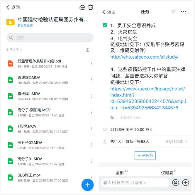 2月24日,由蘇州公司綜合辦公室牽頭組織公司全員開展了共24課時的專題培訓課程,利用釘釘、微信等網絡通信工具開展線上培訓,課程涉及了疫情防控知識、安全生產、質量體系、防水施工等多種形式的內容,每天在釘釘中發布培訓課程任務,員工通過分享任務鏈接參加培訓課程完成任務,操作簡便、形式多樣。