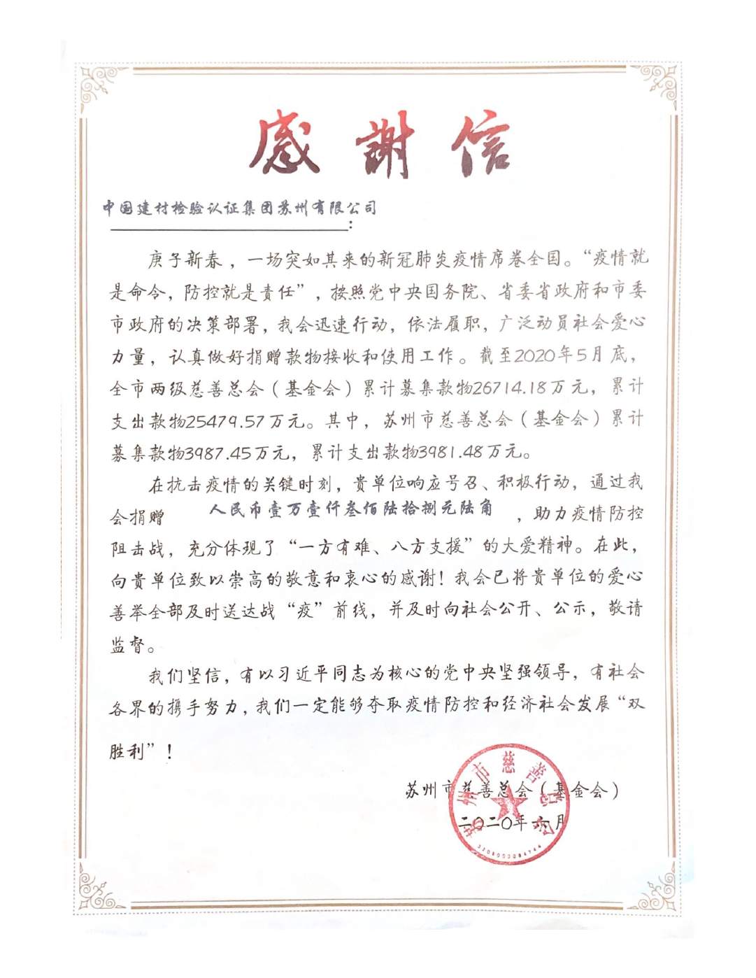 蘇州公司收獲慈善總會(huì)感謝信