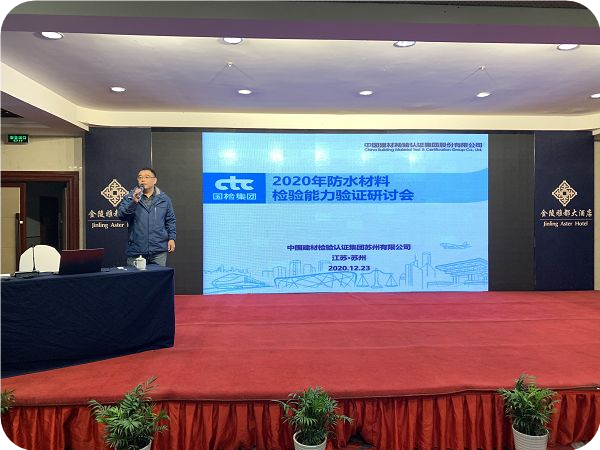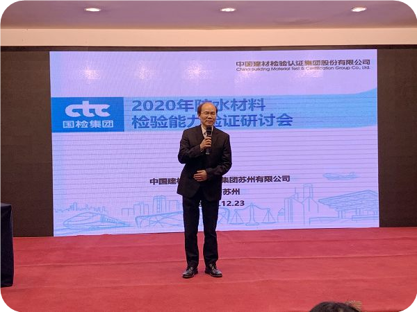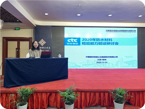 2020年12月23日,由中國建材檢驗認證集團蘇州有限公司組織開展的“建筑防水卷材檢驗?zāi)芰︱炞C項目總結(jié)暨實驗室比對技術(shù)研討會”在蘇順利召開,共有約60名來自全國各地的防水企業(yè)質(zhì)量檢驗代表參加了此次會議。CTC蘇州公司總經(jīng)理朱德明、副總經(jīng)理王瀾出席了此次會議。本次會議由認證鑒定部負責(zé)人朱曄主持。