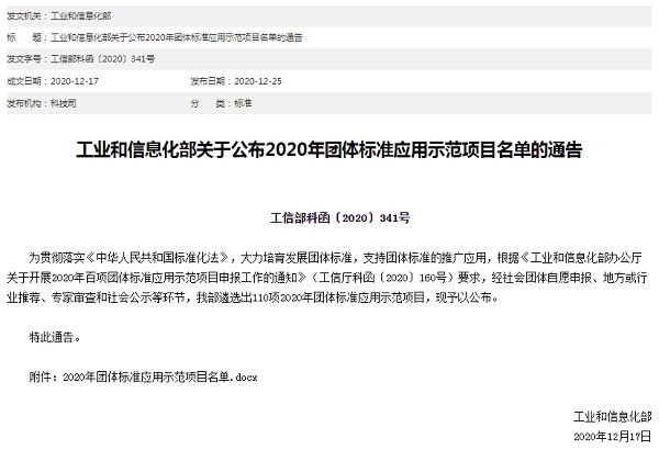 工業和信息化部2020年12月25日發布了《關于公布2020年團體標準應用示范項目名單的通告》[工信部科函〔2020〕341號],該文件公布了110項2020年團體標準應用示范項目。