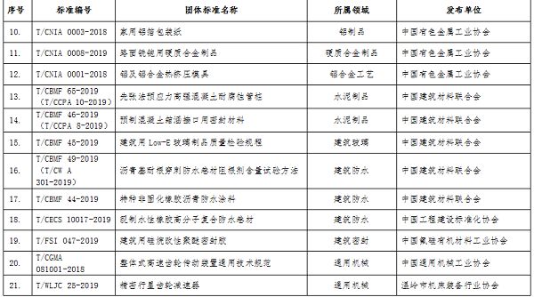 其中我司負責起草的兩項團體標準:T/CBMF 49-2019/T/CWA301-2019《瀝青基耐根穿刺防水卷材阻根劑含量試驗方法》、T/CBMF 44-2019《特種非固化橡膠瀝青防水涂料》列入其中。建材領域僅七項入選。