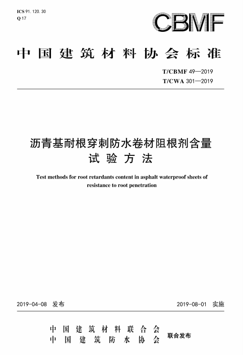 T/CBMF 49-2019/T/CWA301-2019《瀝青基耐根穿刺防水卷材阻根劑含量試驗方法》,負責起草單位:中國建材檢驗認證集團蘇州有限公司、中國建材檢驗認證集團股份有限公司、北京東方雨虹防水技術股份有限公司、中國建筑防水協會。該標準由中國建筑材料聯合會和中國建筑防水協會共同歸口。本標準乃全球首個化學阻根劑含量試驗方法標準,填補了本領域多年空白。標準試驗方法效率高,檢測成本低,且高效迅速,可用于耐根穿刺性能的一致性評估,縮短檢測時間,重復性、再現性好,試驗結果具有極高的可信度。本標準的最重要的應用示范效果在于可以幫助企業改進配方工藝,便于確認加入多少阻根劑具有耐根穿刺效果,可用于耐根穿刺性能的一致性評估,縮短檢測時間。本標準的發布有利于工程質量控制,工程質量提升;有利于政府監管,提高產品可靠性;也有利于幫助先進企業提高市場份額,打擊違規造假企業,最終提供給市場的是最優質的種植屋面防水產品,以滿足人民日益增長的美好生活需求。