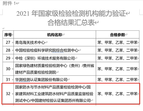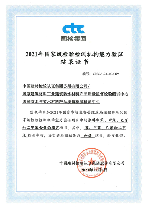 近日,國家市場監督管理總局官網發布2022年第5號通告,公布2021年國家級檢驗檢測機構能力驗證結果。中國建材檢驗認證集團蘇州有限公司(國家防水與節水材料產品質量檢驗檢測中心/國家建筑材料工業建筑防水材料產品質量監督檢驗測試中心)參加了本次涂料中苯、甲苯、乙苯和二甲苯含量的測定能力驗證并獲得滿意結果。