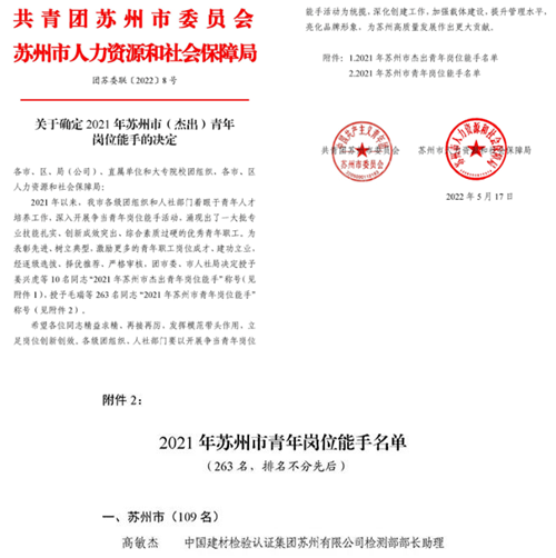 近日,喜訊傳來,我公司檢測部高敏杰榮獲共青團蘇州委員會、蘇州市人力資源和社會保障局頒發(fā)的“蘇州市青年崗位能手”榮譽稱號。