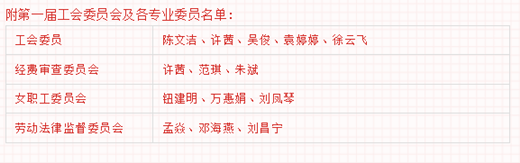 陳文潔、許茜等五位同志當選蘇州公司第一屆工會委員會委員,陳文潔同志當選為第一屆工會委員會主席。許茜等三位同志當選為第一屆經費審查委員會委員。大會同時通過了女工委員會和勞動法律監督委員會人選。