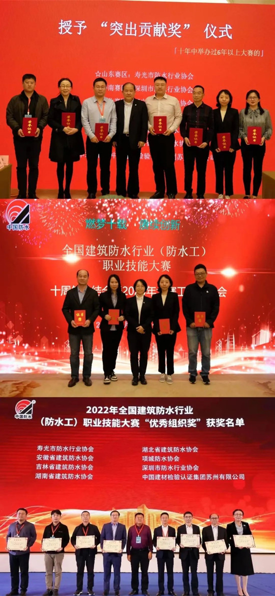 同時,蘇州公司在本次大會也收獲滿滿:蘇州公司獲“賽區突出貢獻獎”、“2022年全國建筑防水行業(防水工)職業技能大賽優秀組織獎”;王瀾、張歆炯獲“優秀裁判員突出貢獻獎”;章丹銘、張歆炯、王浩獲“2022年全國建筑防水行業(防水工)職業技能大賽優秀裁判員獎”;陳建華、袁婷婷、朱怡青、胡沖獲“2022年全國建筑防水行業(物理檢驗員)職業技能大賽優秀裁判員獎”。