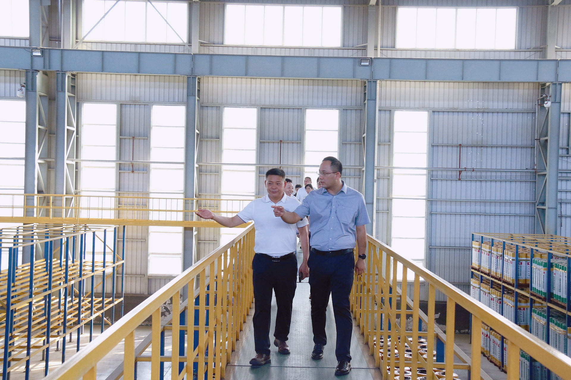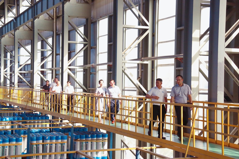 座談會后,孫軍忠帶領彭超一行到桂湖防水科技集團進行了實地參觀。蘇州公司市場運營部經理姚雙華、密封膠檢測室主任沈玉華參與交流。