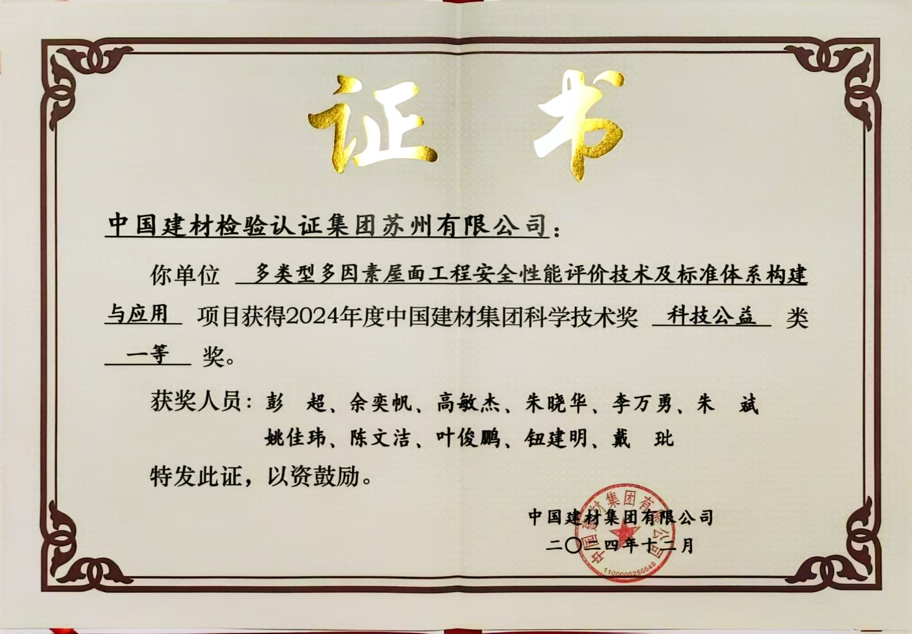 近日,2024年度中國建材集團有限公司科學技術獎獲獎名單正式公布,國檢集團蘇州公司申報的《多類型多因素屋面工程安全性能評價技術及標準體系構建與應用》榮獲科技公益類一等獎。這也是國檢集團蘇州公司成立至今所獲得的最高級別科技榮譽。在2025年1月9日召開的中國建材集團科技創新大會上,國檢集團總經理助理、蘇州公司董事長彭超代表團隊現場領取了獲獎證書。