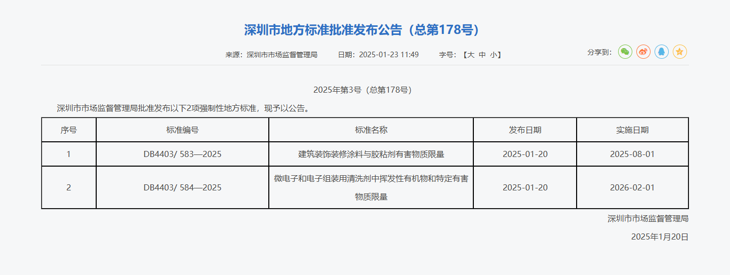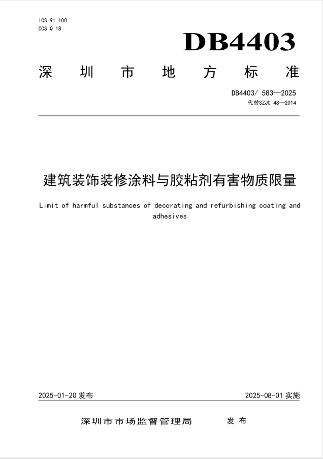 2025年1月20日,深圳市市場監督管理局發布公告(總第178號),《建筑裝飾裝修涂料與膠粘劑有害物質限量》(DB4403/ 583-2025代替SZJG 48-2014),標準將于2025年8月1日正式實施。