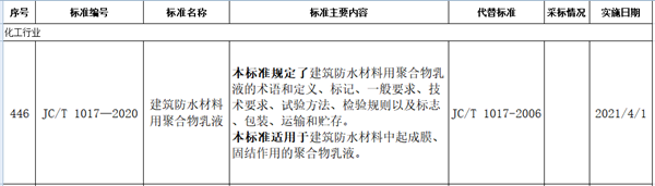 “建筑防水材料用聚合物乳液”等一批行業新標準4月啟用