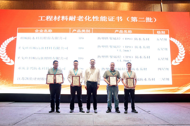 會(huì)上,彭超、朱志遠(yuǎn)、王瀾代表國(guó)檢集團(tuán)蘇州公司為第二批獲得“工程材料耐老化性能證書(shū)”的企業(yè)頒發(fā)了證書(shū)。獲證企業(yè)包括科順股份、圣戈班科順、四川金興、凱倫股份、北新防水、大禹防水、中廣核高新核材、安徽德淳、宏源防水等高分子卷材行業(yè)等優(yōu)秀企業(yè)。