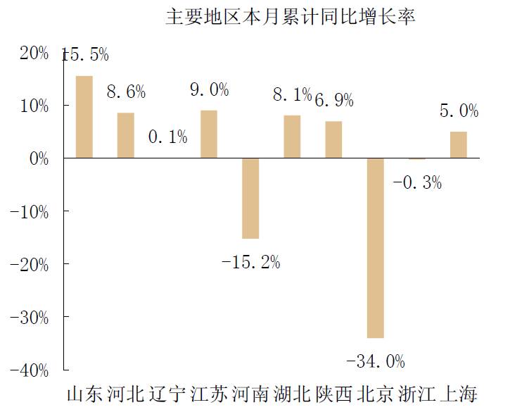 各地區中,山東地區的瀝青類防水卷材累計產量增長最快,為15.5%。有3個地區的累計產量出現負增長,其中北京地區累計產量下降34.0%。