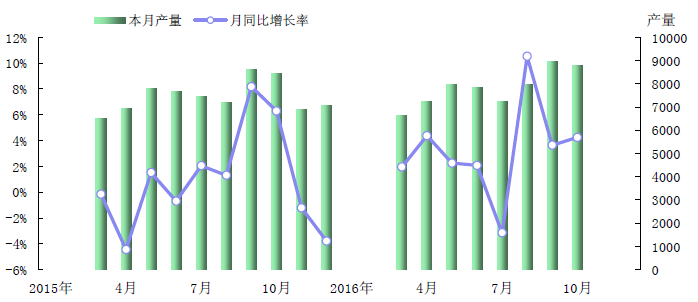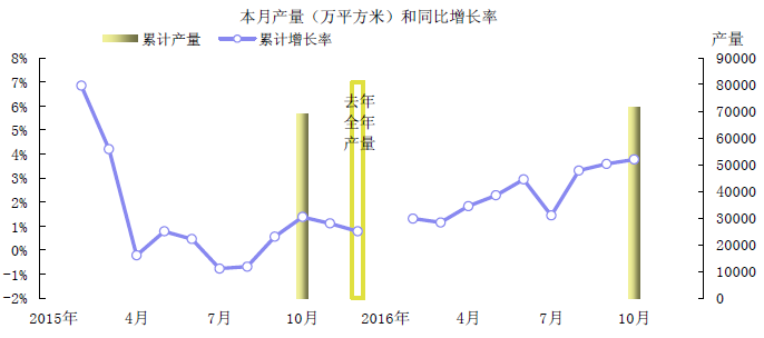 2016年1-10月,規模以上企業的瀝青類防水卷材產量為71617萬平方米 ,比去年同期增長3.8%。