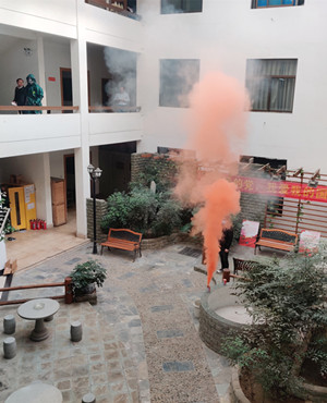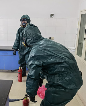 此次演練首次采用了設定劇本—桌面演練--現場演練—開會總結模式,根據應急組織體系、把總指揮、滅火救援組、警戒疏散組、醫療救護組、通訊聯絡組職責一一落實到人,將實驗室發生化學品泄露,處理過程發生火災等事件串聯起來,同時進行化學品泄露應急演練、火災事故應急演練、緊急疏散應急演練、危廢處理演練等。